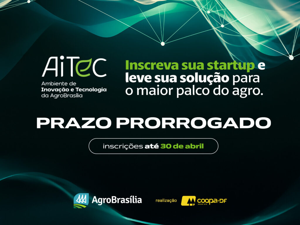 Foram prorrogadas as inscrições para startups que desejam apresentar soluções no Ambiente de Inovação e Tecnologia (AiTec) da AgroBrasília 2026. O novo prazo segue até o dia 30 de abril, às 23h59. Para se inscrever, basta acessar o site www.agrobrasilia.com.br e clicar no link da plataforma disponível no edital.